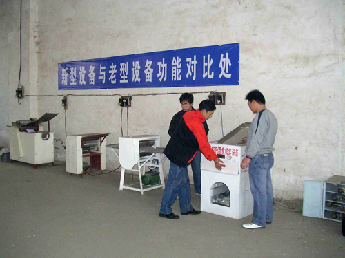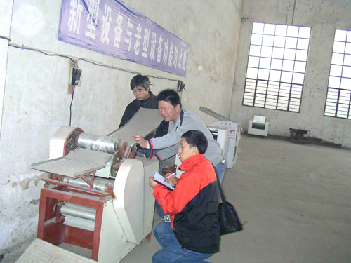 南陽客戶實地考察更換自動疊片燴面機 南陽馬老板在10年前就開始做燴面片批發,最早用的一品鮮Hmj-3型設備,經過10年的辛苦經營,目前每天做面30多...[了解詳情]